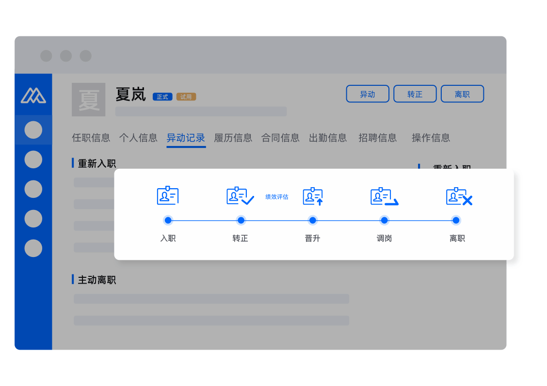 - 入转调离全生命周期管理: 入、转、调、离全生命周期管理,基于时间轴可回溯、追踪员工成长轨迹,便于企业规划人才发展路径。
