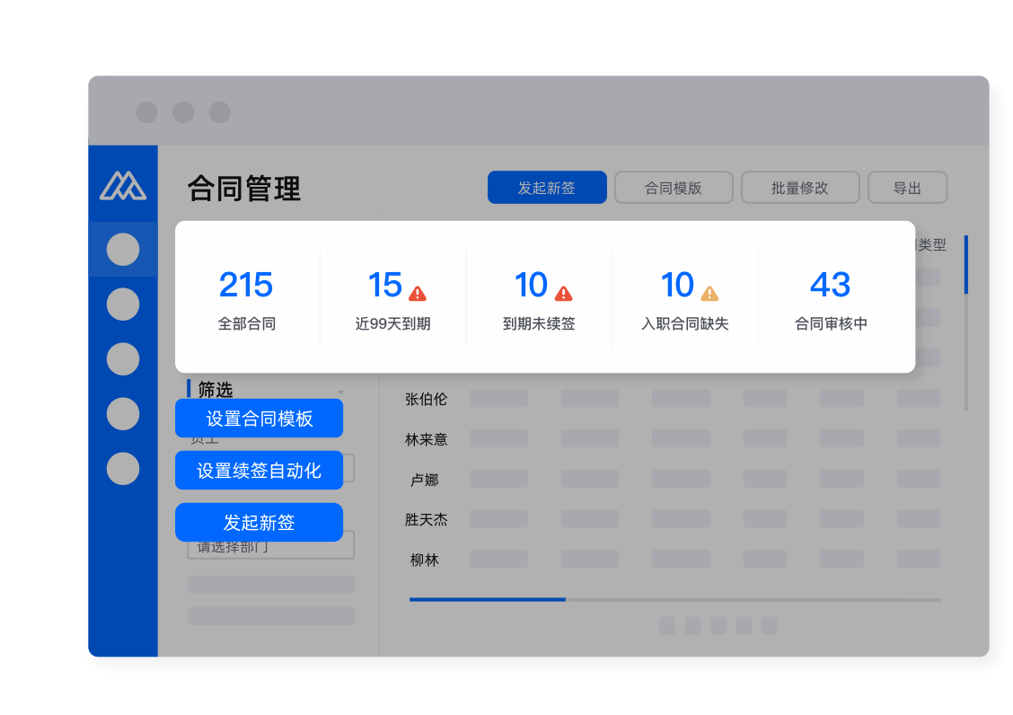 合同到期自动提醒续签: 到期自动提醒,换签、续签流程自动发起,提升管理效率,规避续签不及时的风险。