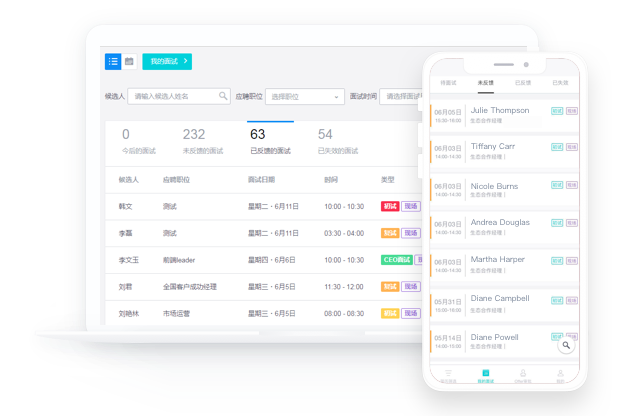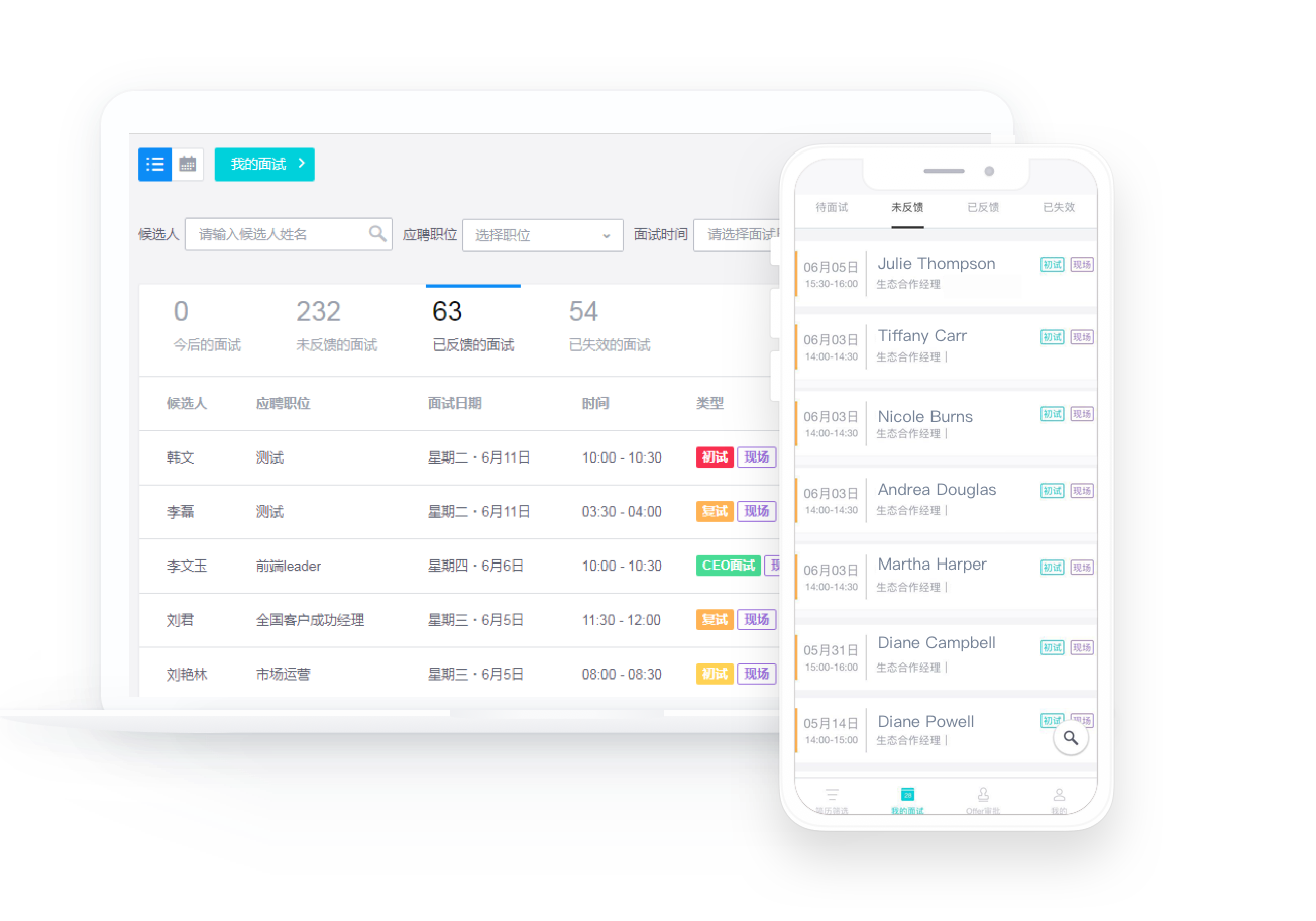 - 移动办公: 移动端和PC端信息协同,随时随地高效协作,提升招聘效率;