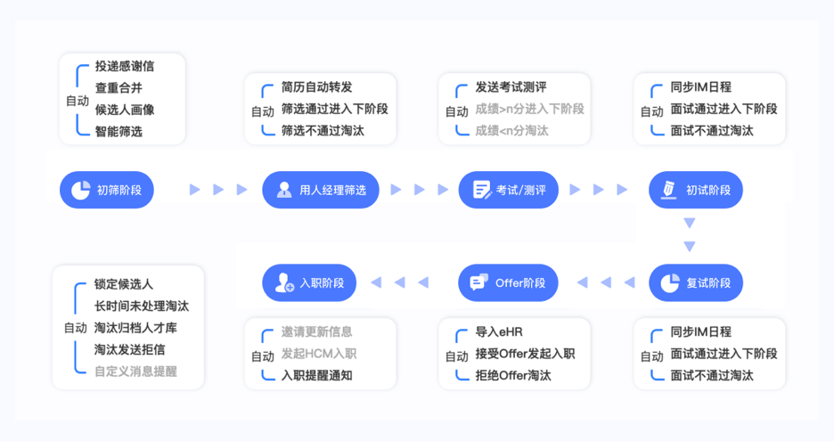 在不同的招聘流程节点设置触发规则,实现招聘环节自动进入下一阶段,自动推进招聘流程,免去HR一遍遍与用人部门的沟通催促工作,直接借助系统在线沟通,有效节省HR的时间成本。