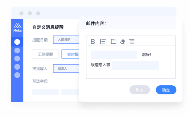 降低招聘流程的复杂性,Moka招聘管理系统支持HC一键发布到所有招聘渠道;HR对重要事项设置消息自动提醒;对重要流程节点自动推送感谢信,以及候选人入职信息自动导入eHR等。