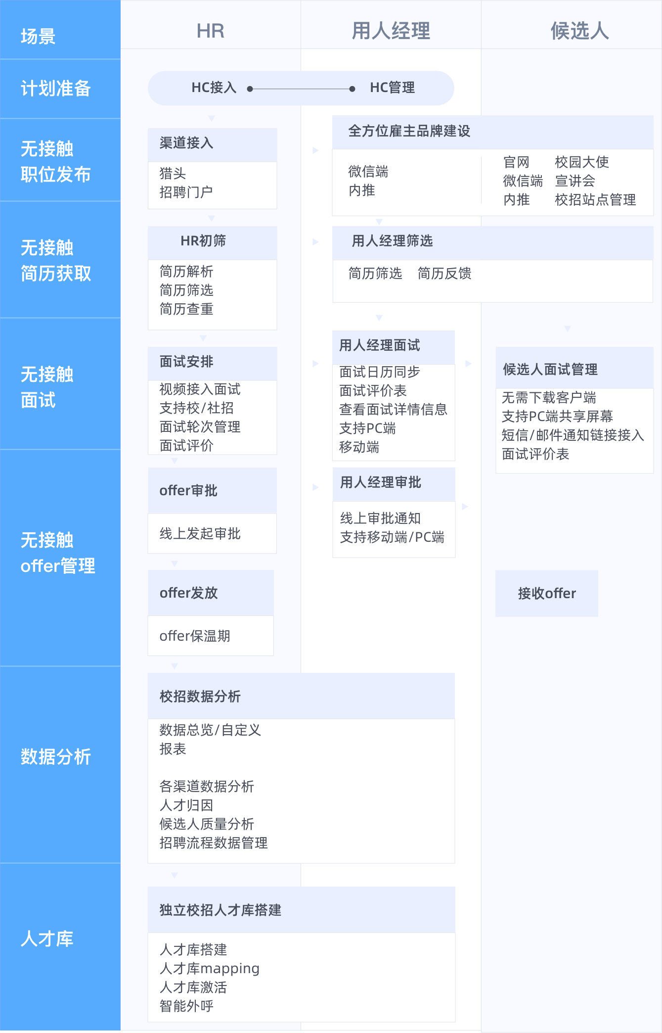 HR、候选人、用人经理三方面试信息同步,减少重复沟通。